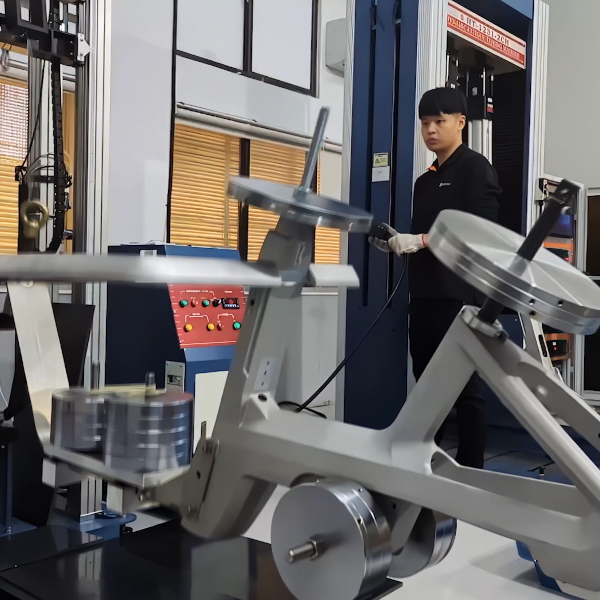 Om het frame en de kwaliteit te testen, voeren we vermoeidheidstests uit die intensief gebruik simuleren. Tijdens deze tests worden afzonderlijke constructiedelen blootgesteld aan extreme belasting.